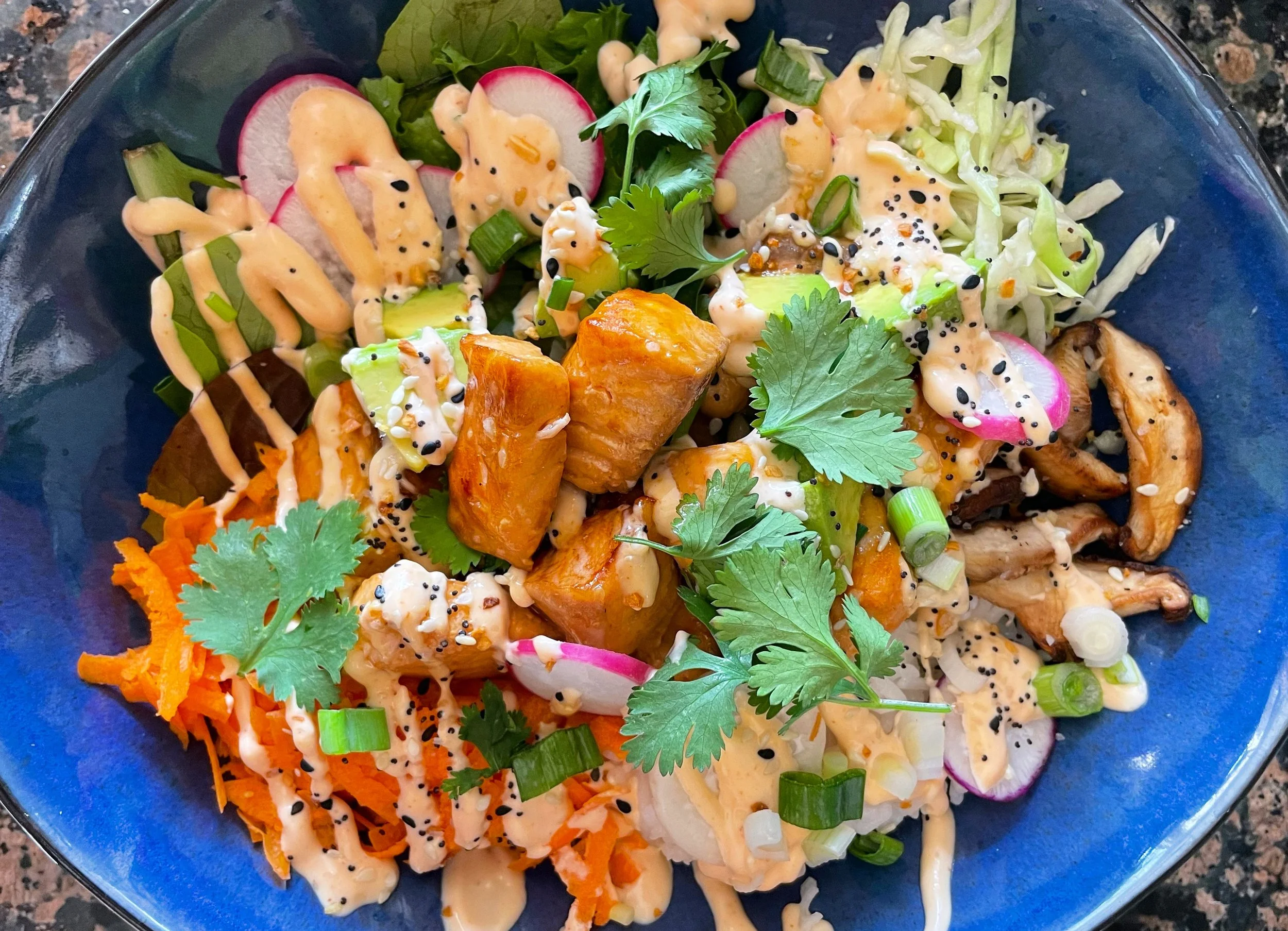Divide rice, if using, among bowls and top with greens, cabbage, and any or all of the toppings you wish. Divide salmon among bowls. Sprinkle with everything bagel seasoning, cilantro and drizzle with sriracha mayonnaise.