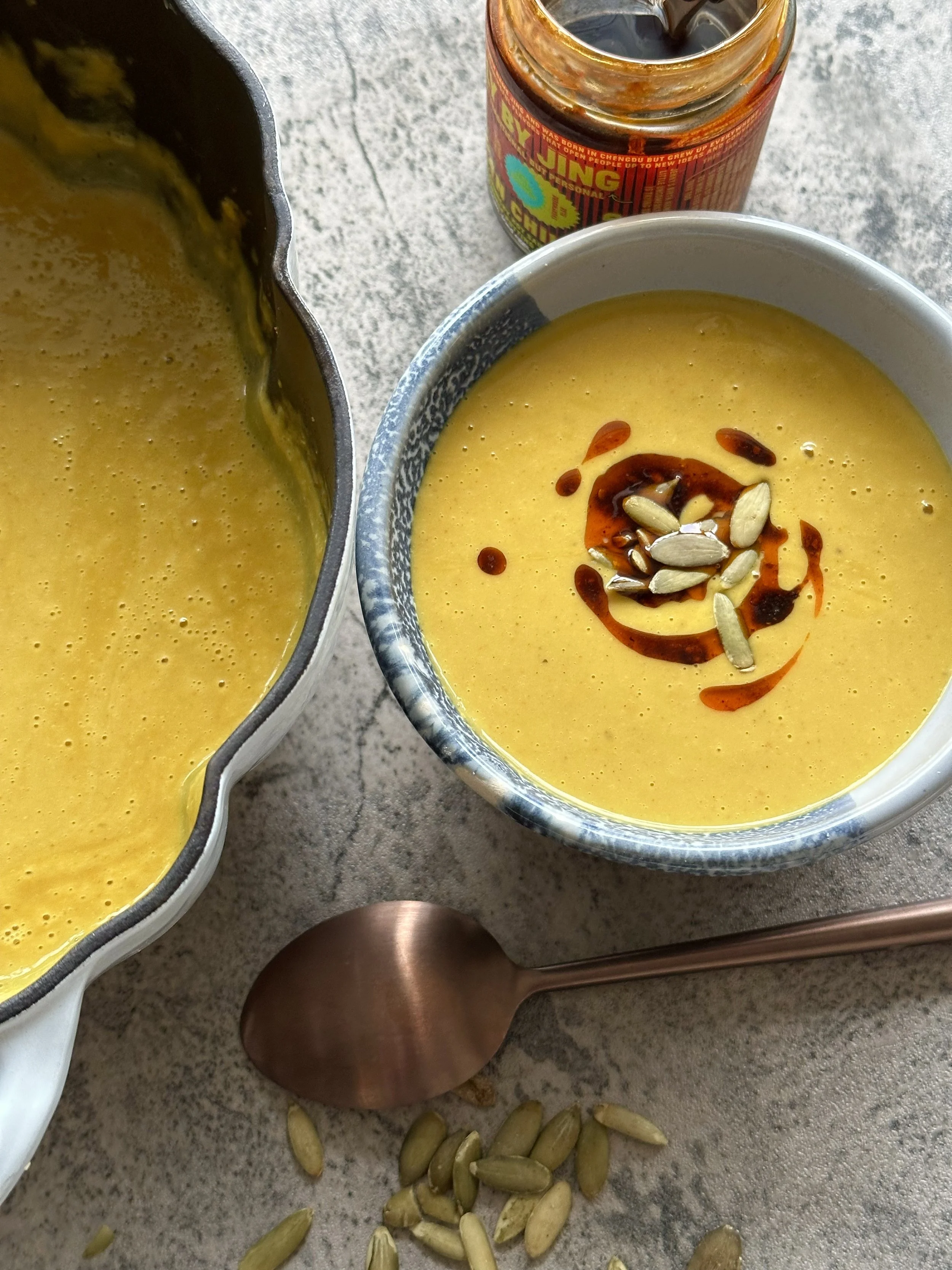 Garnish with toasted pumpkin seeds and chili garlic paste if desired.